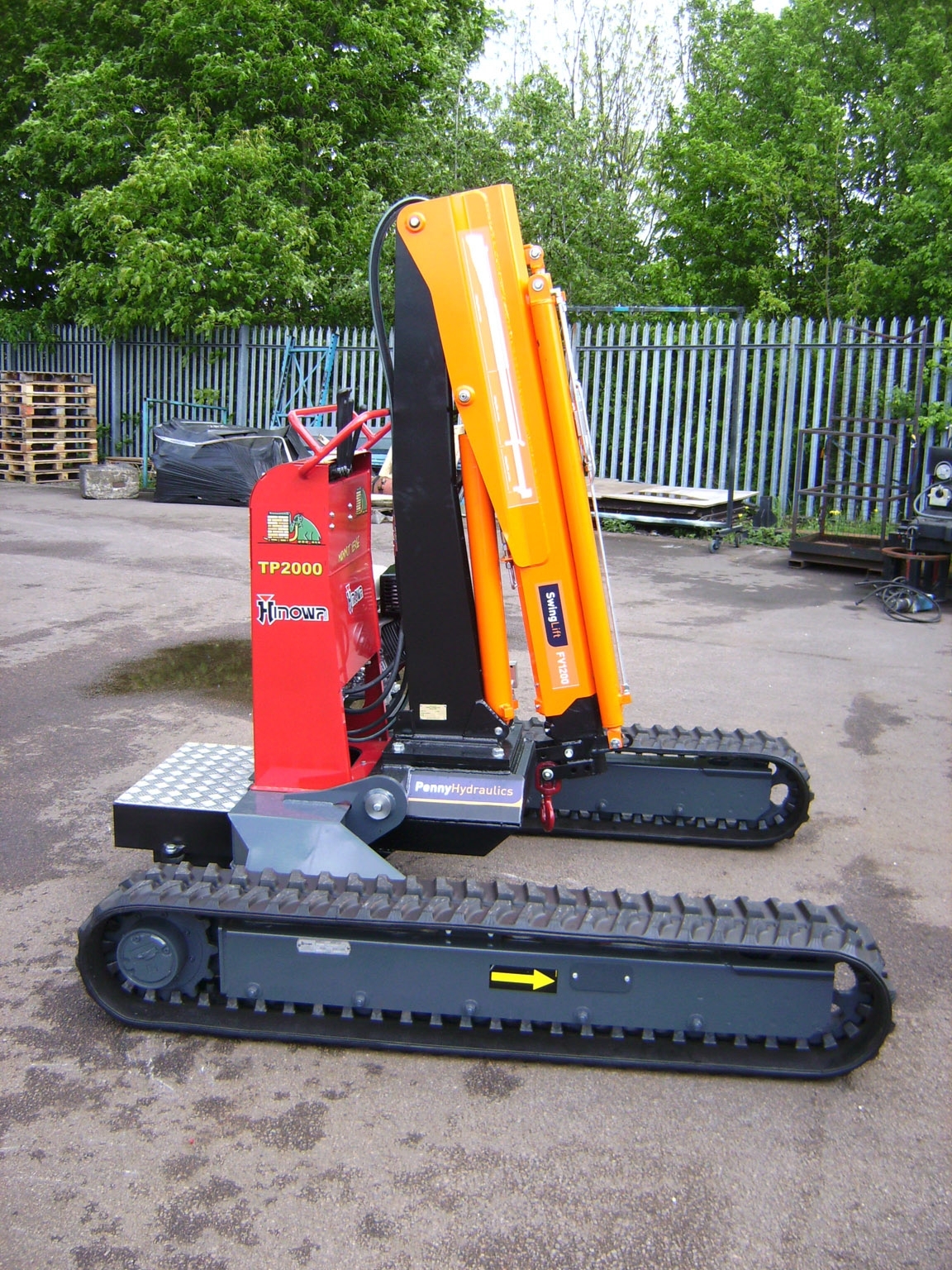 The unit is based around a unique combination of the Hinowa TP2000 tracked chassis and the Penny Hydraulics FV1200 fully hydraulic crane. The TP2000 is a compact tracked chassis, powered by a Honda GX390 petrol engine, that can be used with a wide range of attachments. The addition of the Penny Hydraulics FV1200 provides a highly versatile load handling solution. This fully hydraulic crane, introduced for the commercial vehicle market in 2008, has a maximum lifting capacity of 1200kg at 1.5 metres, a generous 450kg when the boom is extended to 3.5 metres and 250kg at full 4.3 metre extension.
