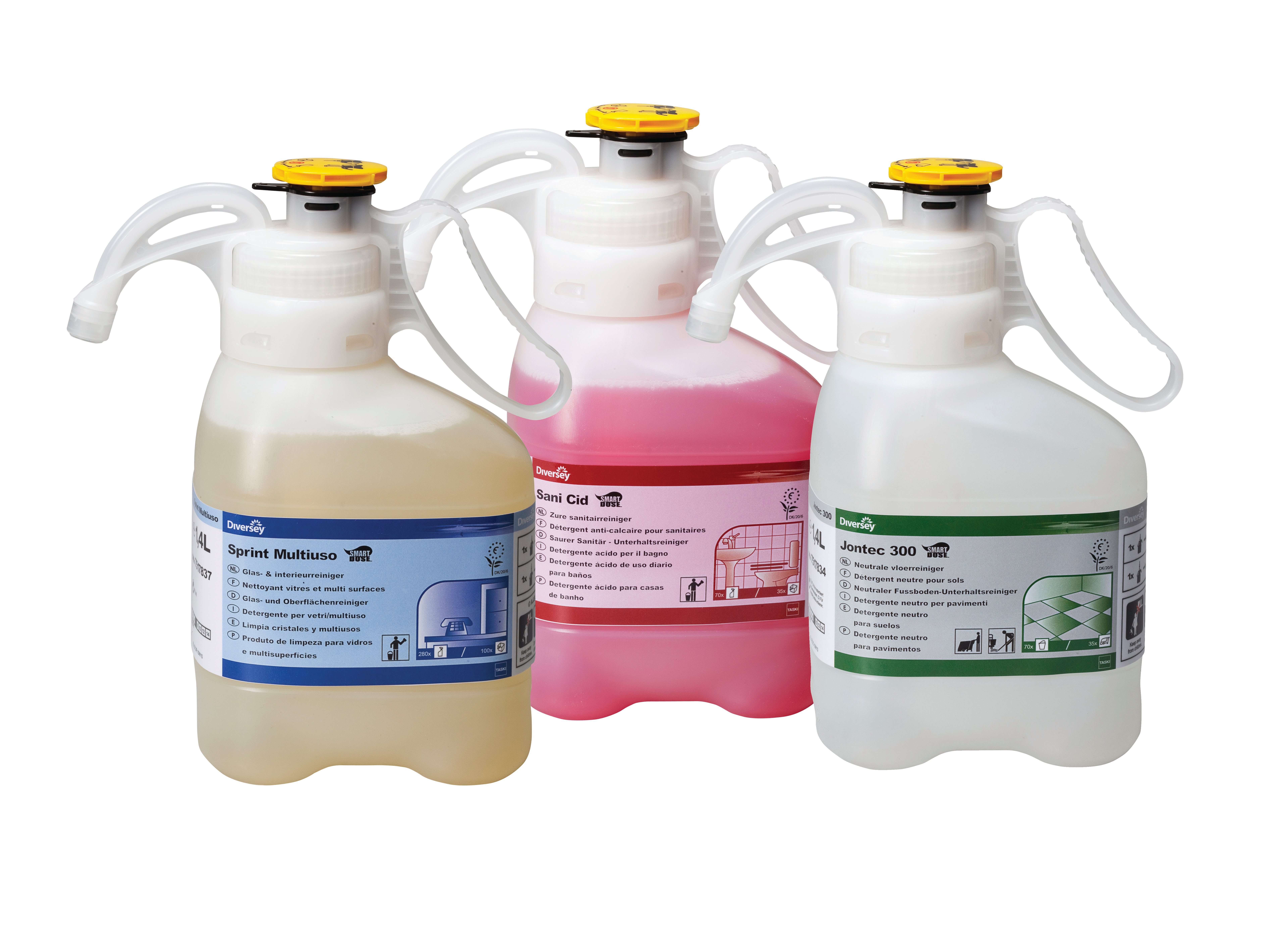 Many cleaning operations do not have the scale, frequency or intensity to justify the investment required for systems such as QuattroSelect or J-Flex. Instead, Diversey Care offers ultra-concentrates in two highly portable formats with similar levels of sustainability and low cost in use.